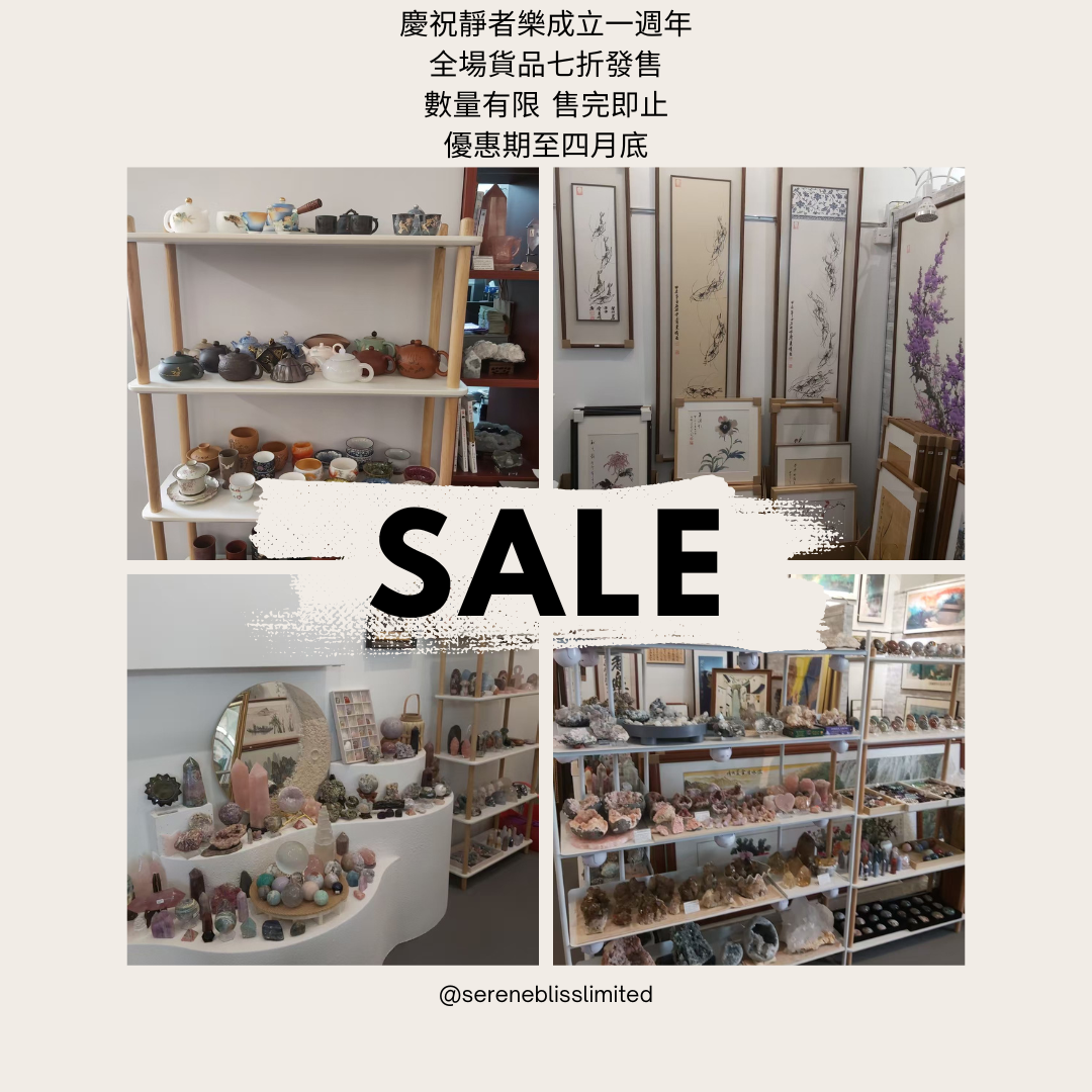 靜者樂成立1週年, 全場貨品7折發售, 優惠期至4月底. 數量有限, 售完即止.